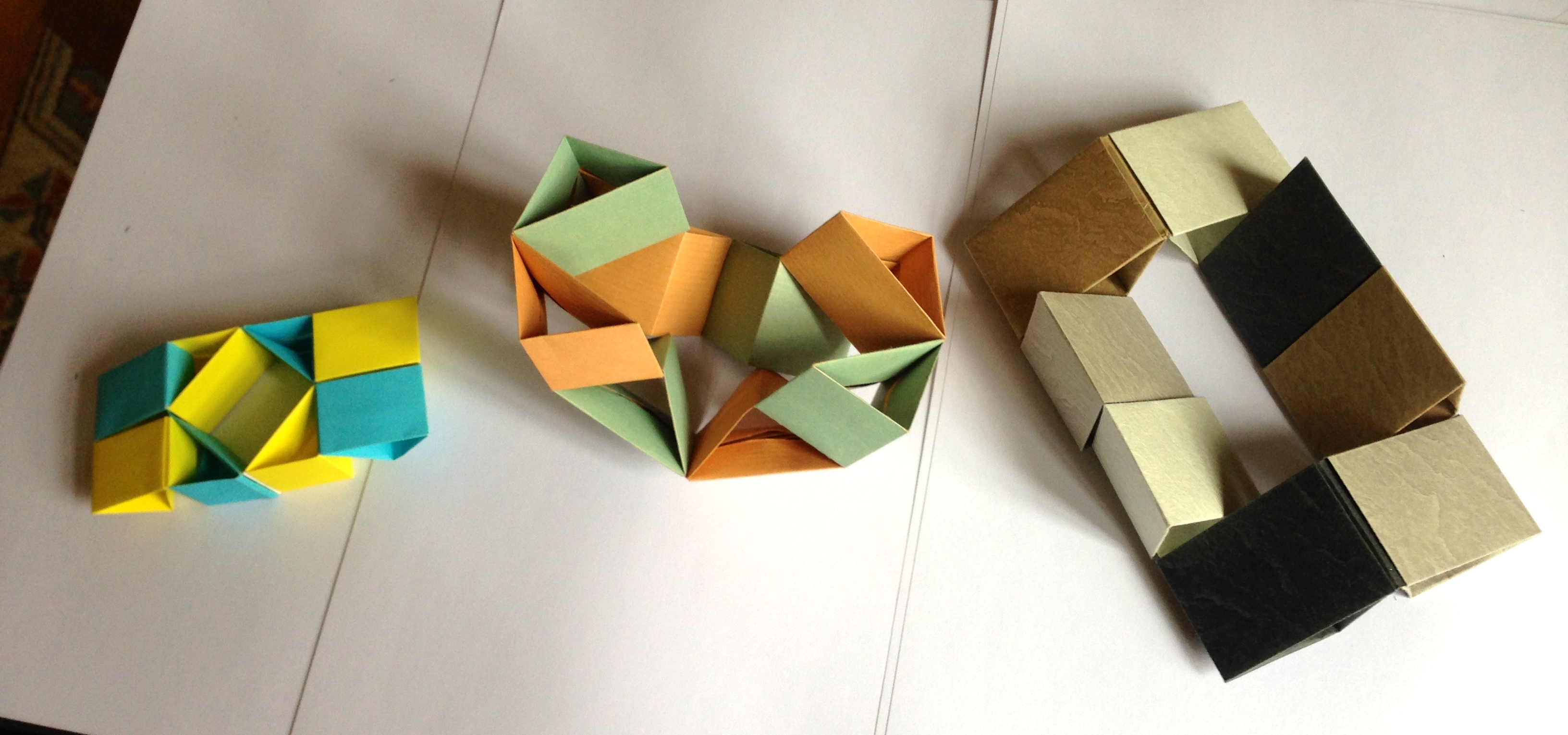 All are inspired by this cut and taped “paper transformer”: https://www.youtube.com/watch?v=ihOkg6ykJ80 The Triangle Flexicube series are pure(ish) origami and are much more complex, and you may think, too much work! Diagrams to follow…