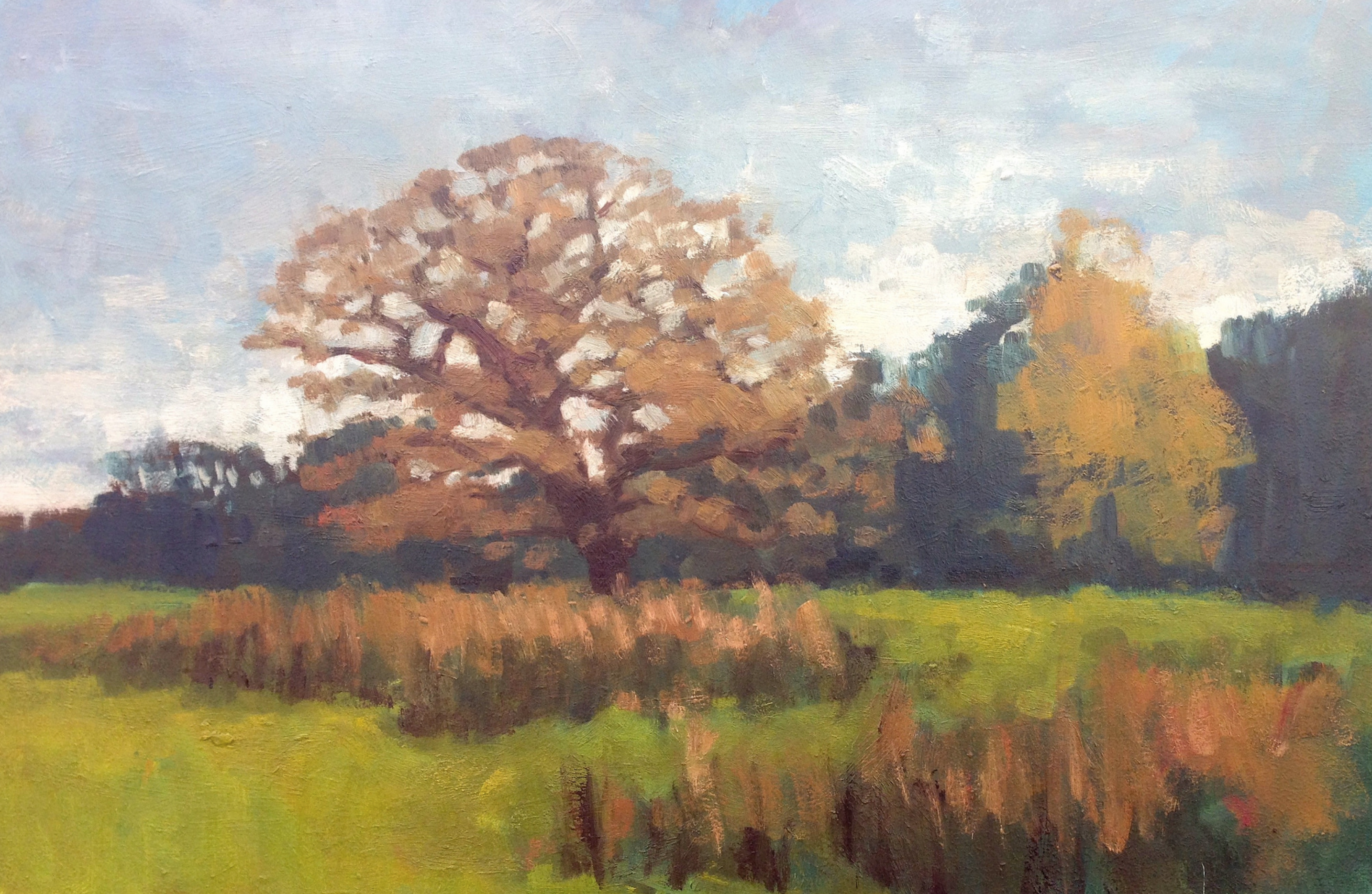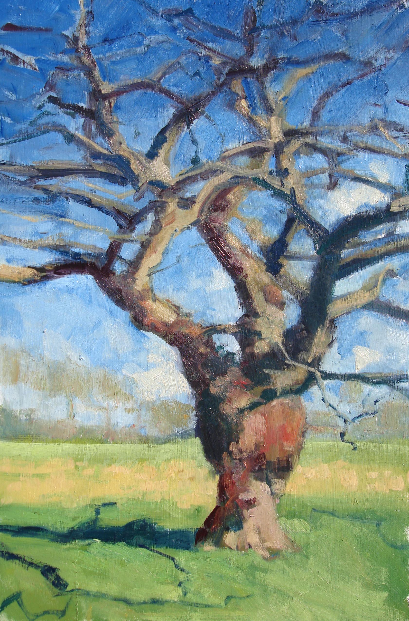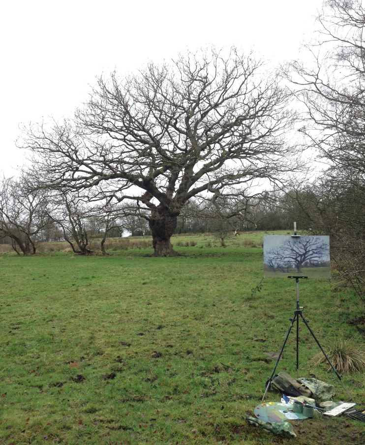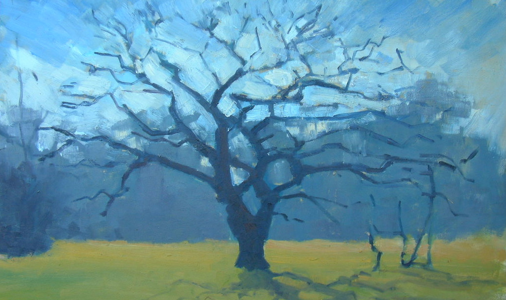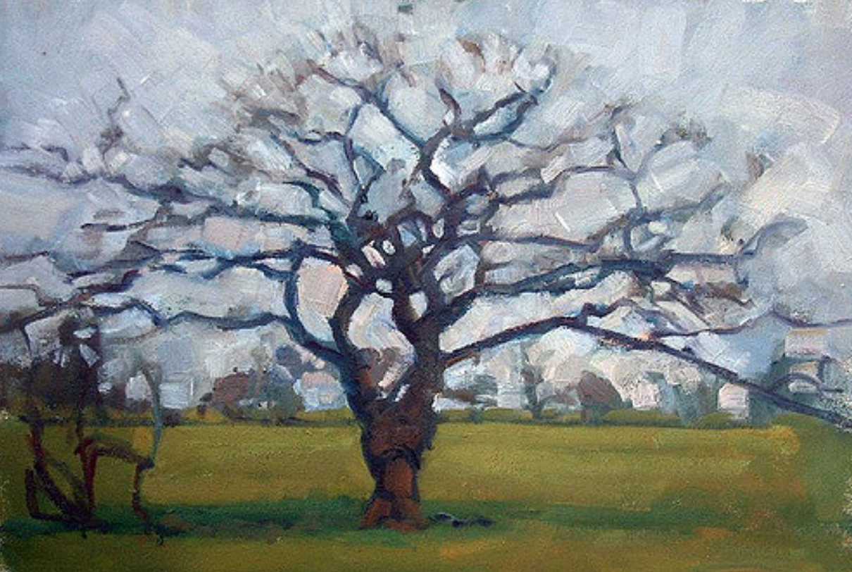 Since moving to my house 23 years ago, I’ve loved and admired this magnificent gnarled oak tree, which is just five minutes from my door. Every time Assia and I walk past it, we stop to admire it, whatever the season. We have been known to have conversation with it. Once, returning from a late session at the pub, I even admit to embracing this wonderful old friend. So of course it has been the subject of a number of paintings over the years. Here are some of them, good, bad and indifferent.