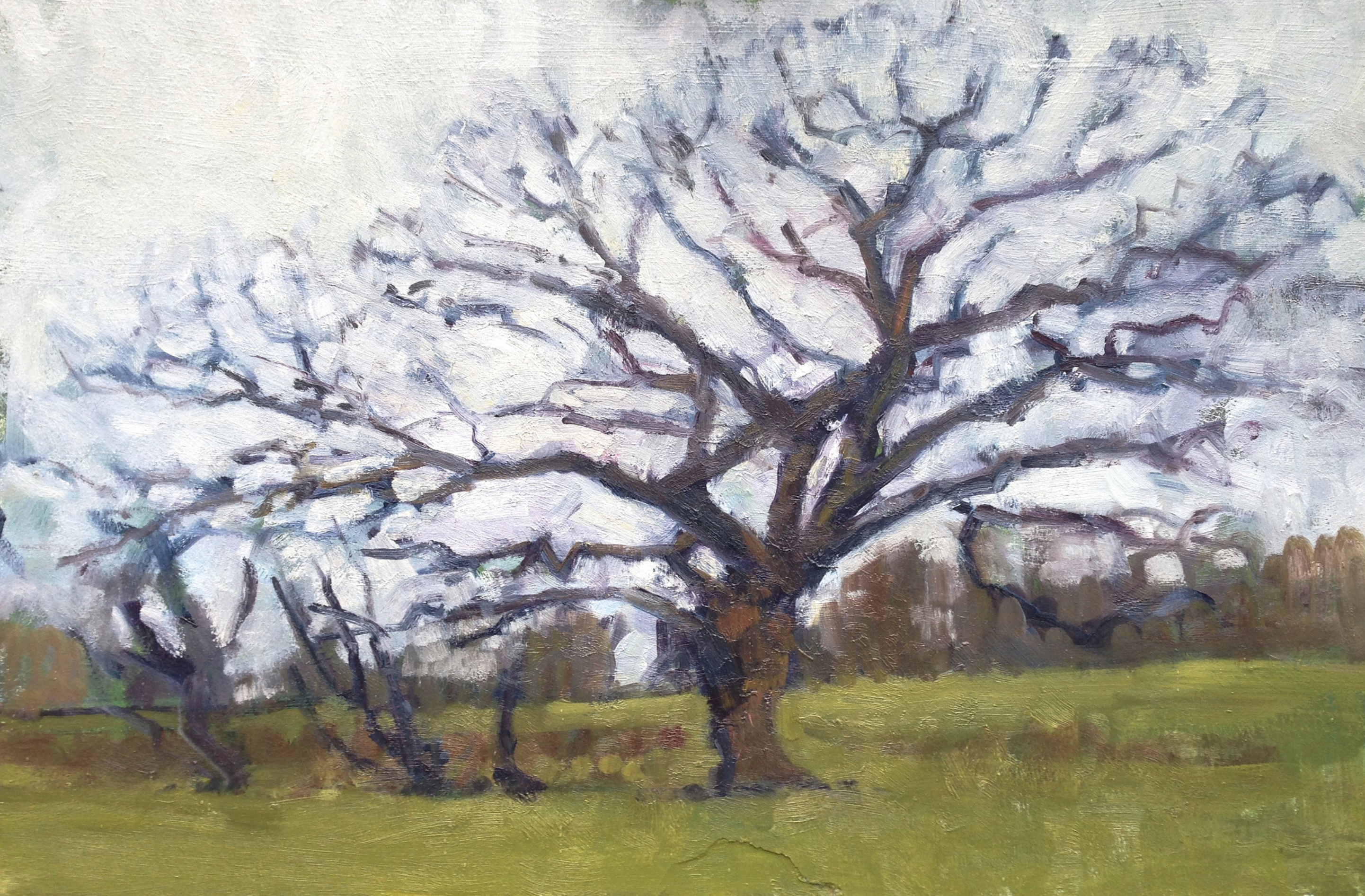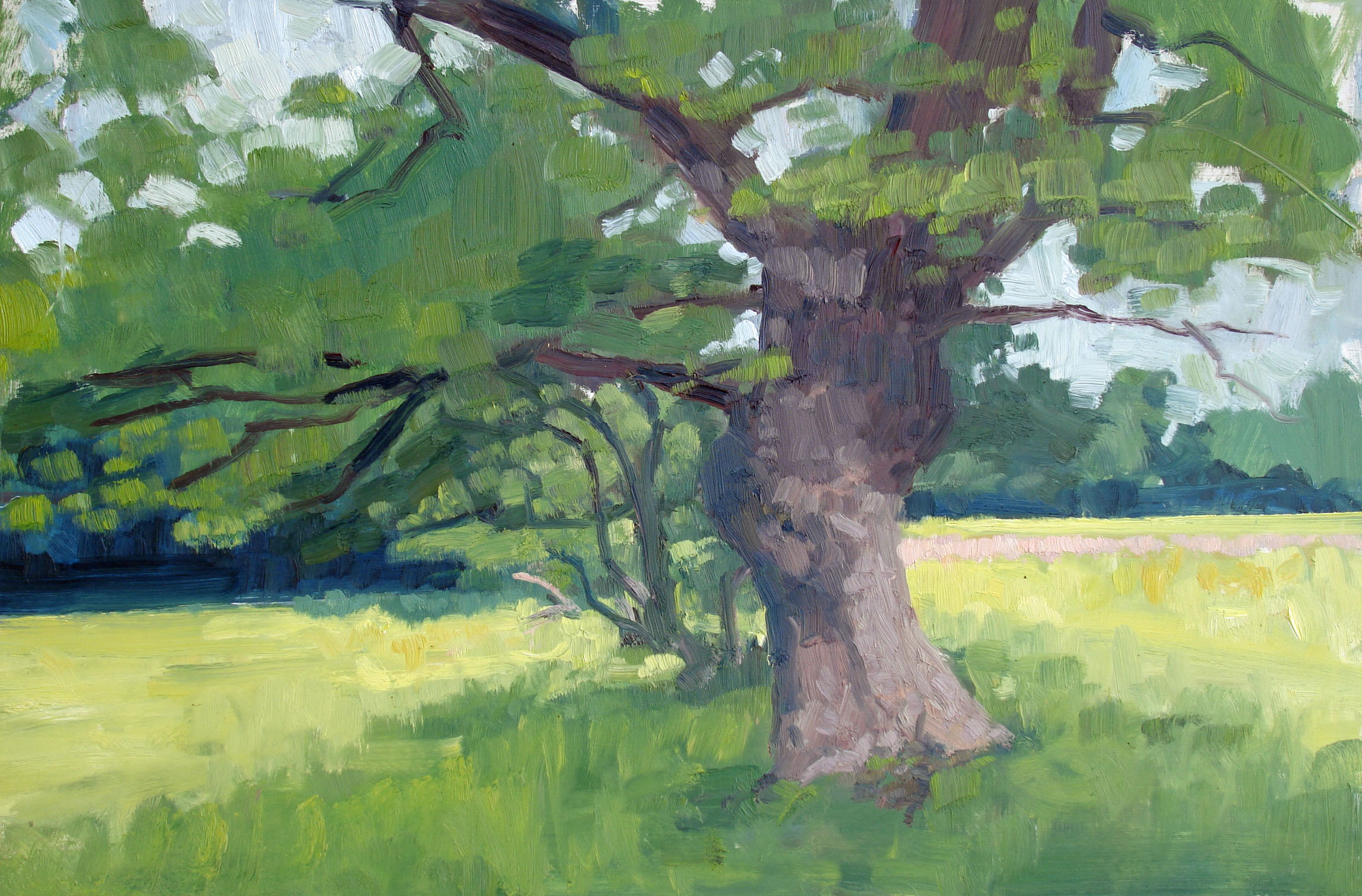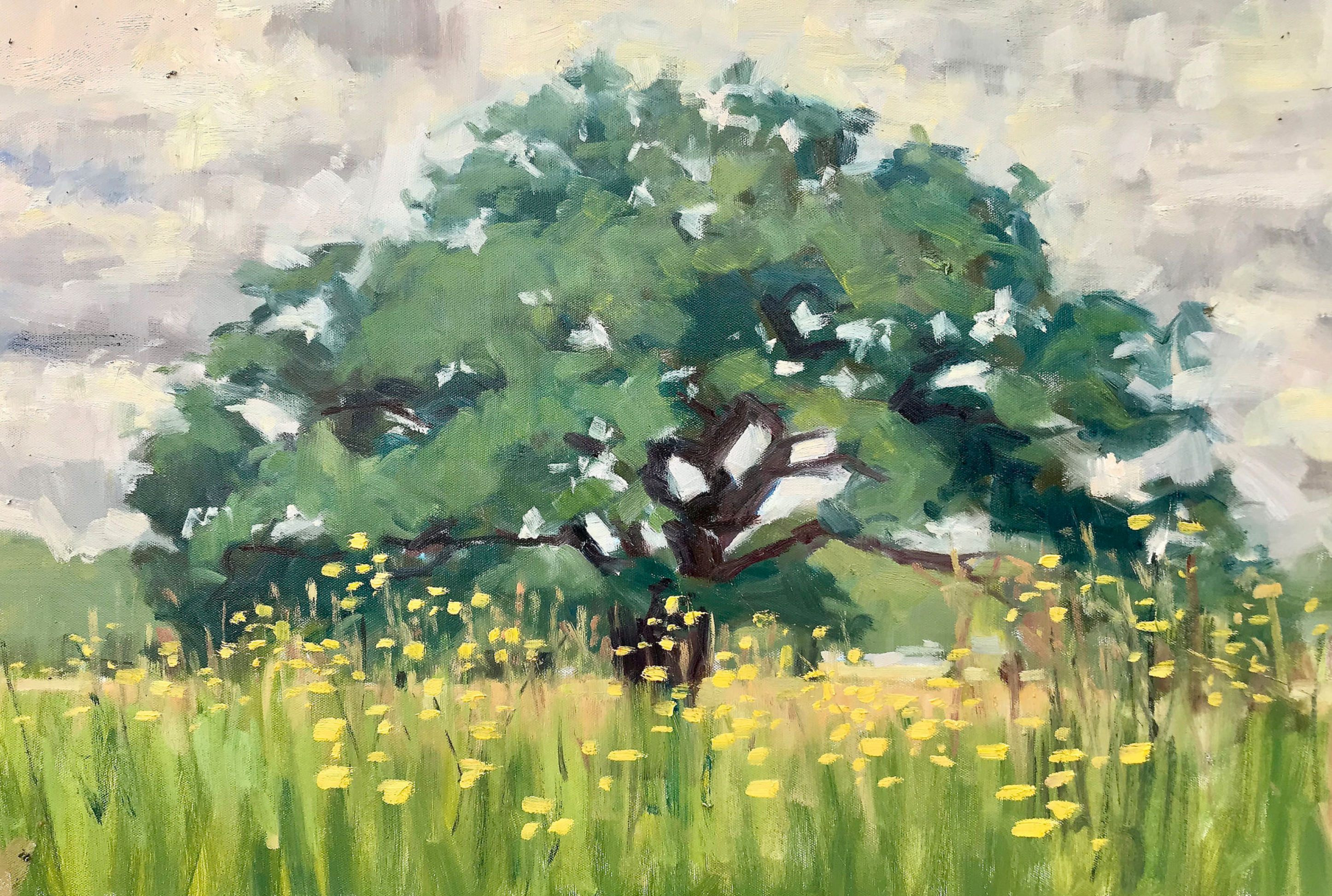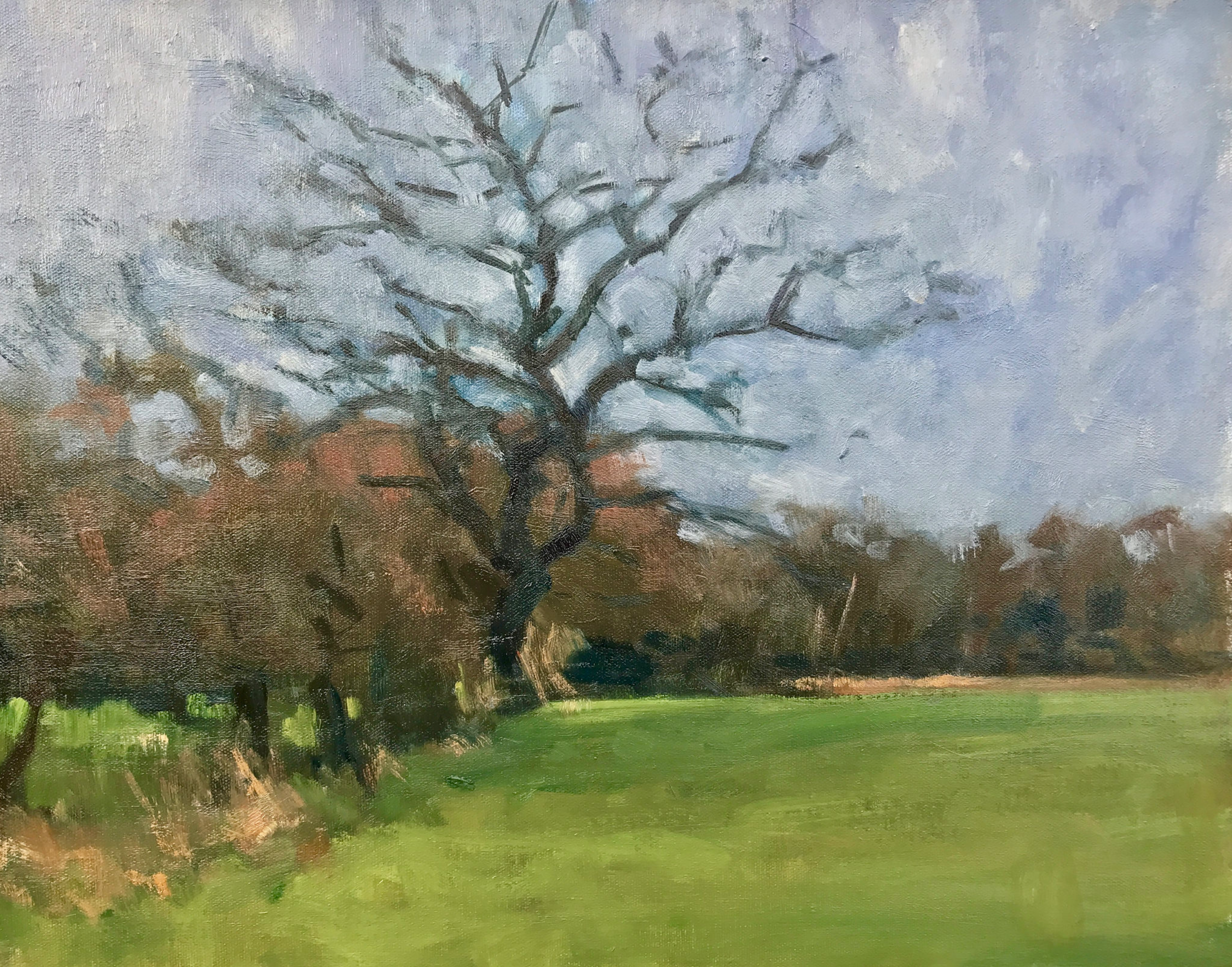 Since moving to my house 23 years ago, I’ve loved and admired this magnificent gnarled oak tree, which is just five minutes from my door. Every time Assia and I walk past it, we stop to admire it, whatever the season. We have been known to have conversation with it. Once, returning from a late session at the pub, I even admit to embracing this wonderful old friend. So of course it has been the subject of a number of paintings over the years. Here are some of them, good, bad and indifferent.