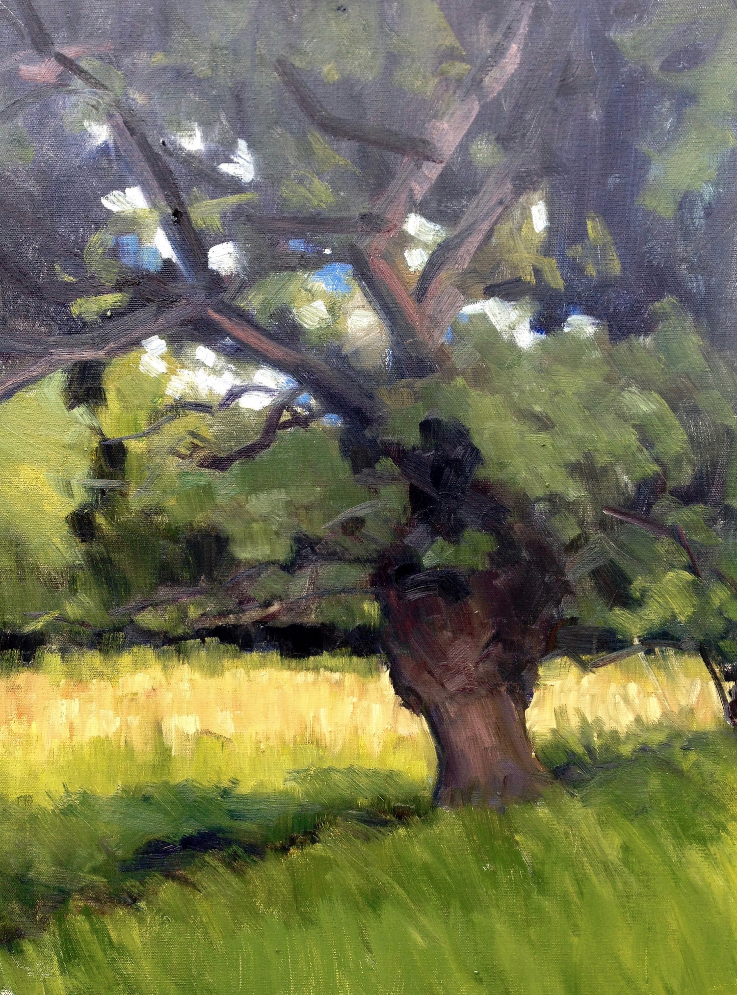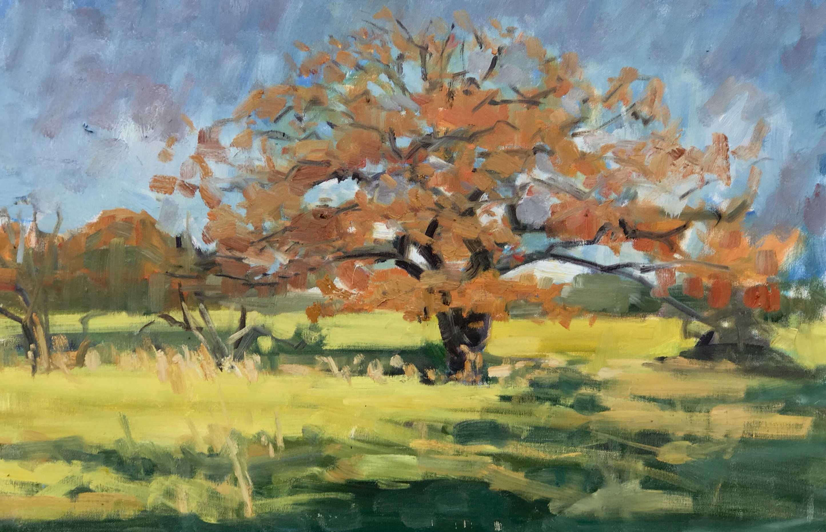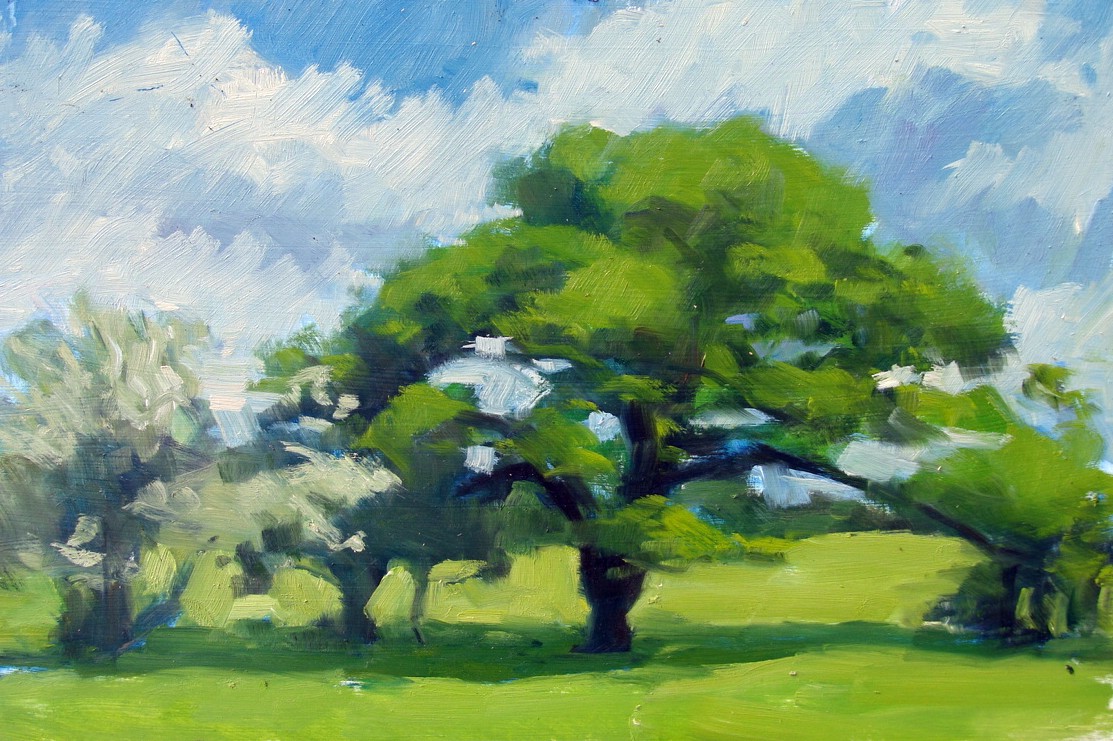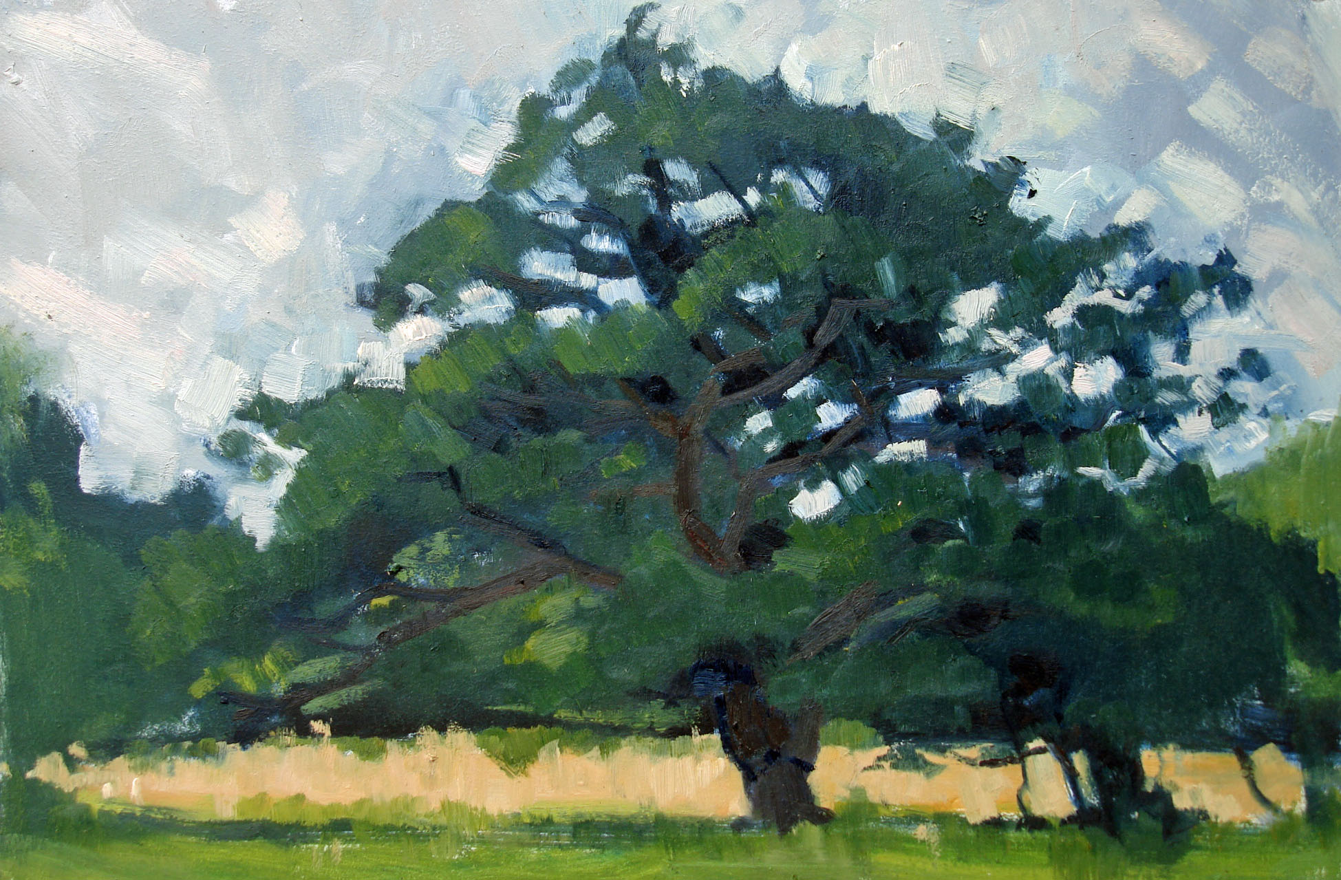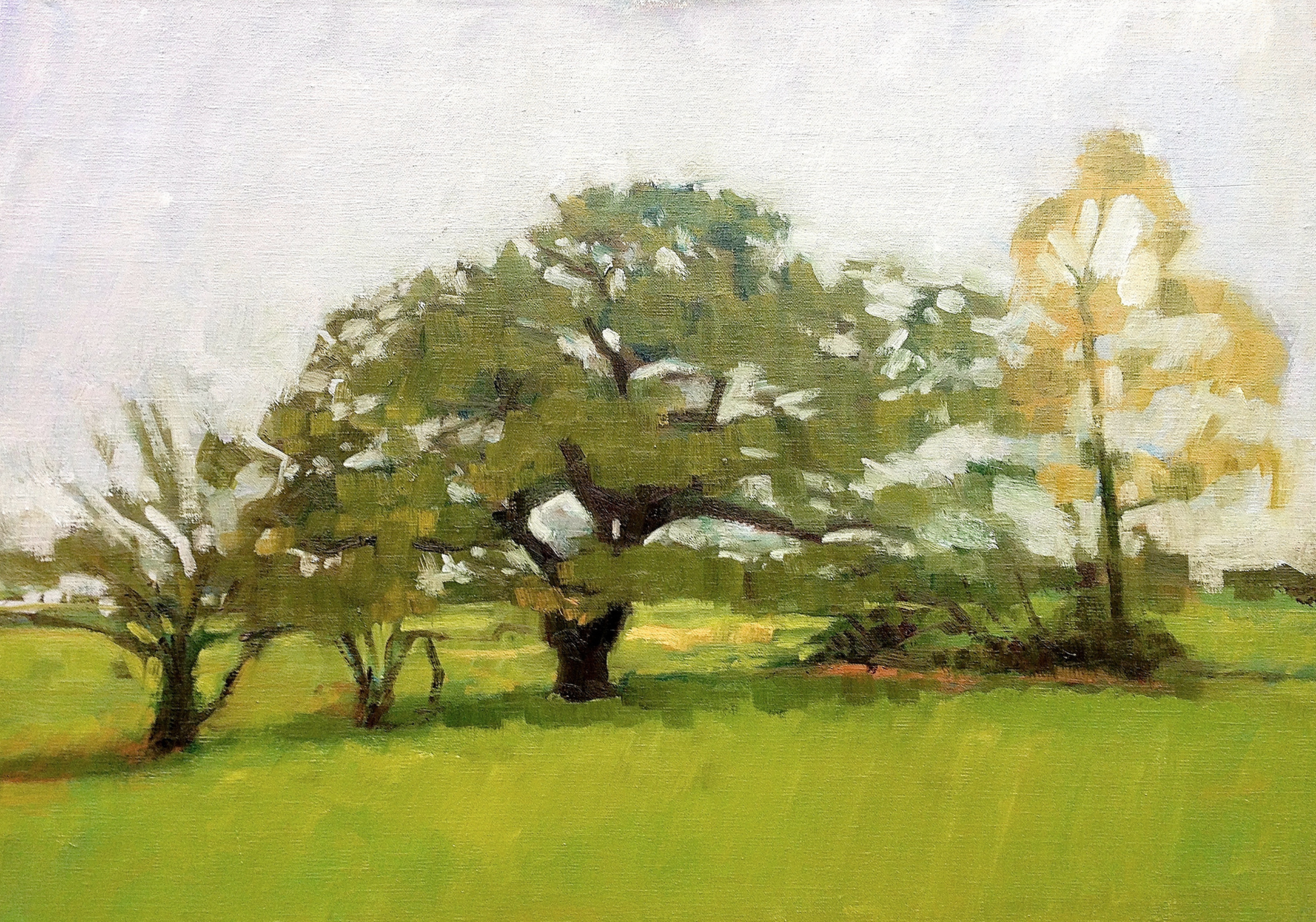 Since moving to my house 23 years ago, I’ve loved and admired this magnificent gnarled oak tree, which is just five minutes from my door. Every time Assia and I walk past it, we stop to admire it, whatever the season. We have been known to have conversation with it. Once, returning from a late session at the pub, I even admit to embracing this wonderful old friend. So of course it has been the subject of a number of paintings over the years. Here are some of them, good, bad and indifferent.