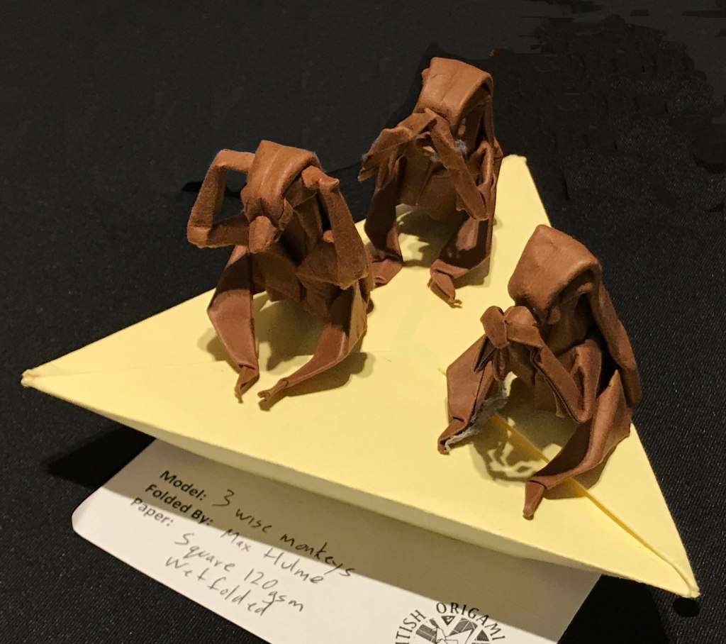 Max’s work showed that the creative process wasn’t down to chance, but instead considered and analytical, and once I’d grasped this my own origami output developed too. Present at that first convention was Martin Wall, and the three of us became friendly rivals. The BOS Whodunnit challenges were triggers for us all and constructive criticism from John Smith and Mick Guy fuelled our energies and steered us onto higher standards. It was a thrilling time!