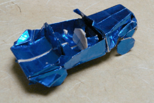 Max carefully catalogued his work with hand drawn diagrams on squared paper which he kept in loose-leaf folders. By analysis of quite a complex object he was able to deduce mentally how it could be achieved in origami even before picking up the paper. He wasn’t afraid of using rectangles: the wonderful vintage London Omnibus is from a 6×1, has a spiral staircase leading to the separate seats on the open top deck. Everyone loves the Lizard from a 4×1 with a curvy tail, lifelike from green foil paper. The popularity of coloured foil backed paper in the 70’s – as favoured by Pat Crawford, Neal Elias and Fred Rohm in the USA – was a gift to Max, who used this material to embark on an amazing range of vehicles. Cars, aeroplanes, railway engines and rolling stock, the series reached its apogee with the Omnibus, the Traction Engine and Stevenson’s Rocket, each a beautifully engineered masterpiece, showing superb conception and elegant economy of the paper. None of these were generic objects, but recognisable origami replicas of specific originals: a Spitfire or a Bugatti. The list of his memorable work is endless: Gorilla Mask, Tipper Truck, Vintage Car, Man on Penny Farthing, Three Wise Monkeys, Traction Engine… everyone has a favourite Hulme design.